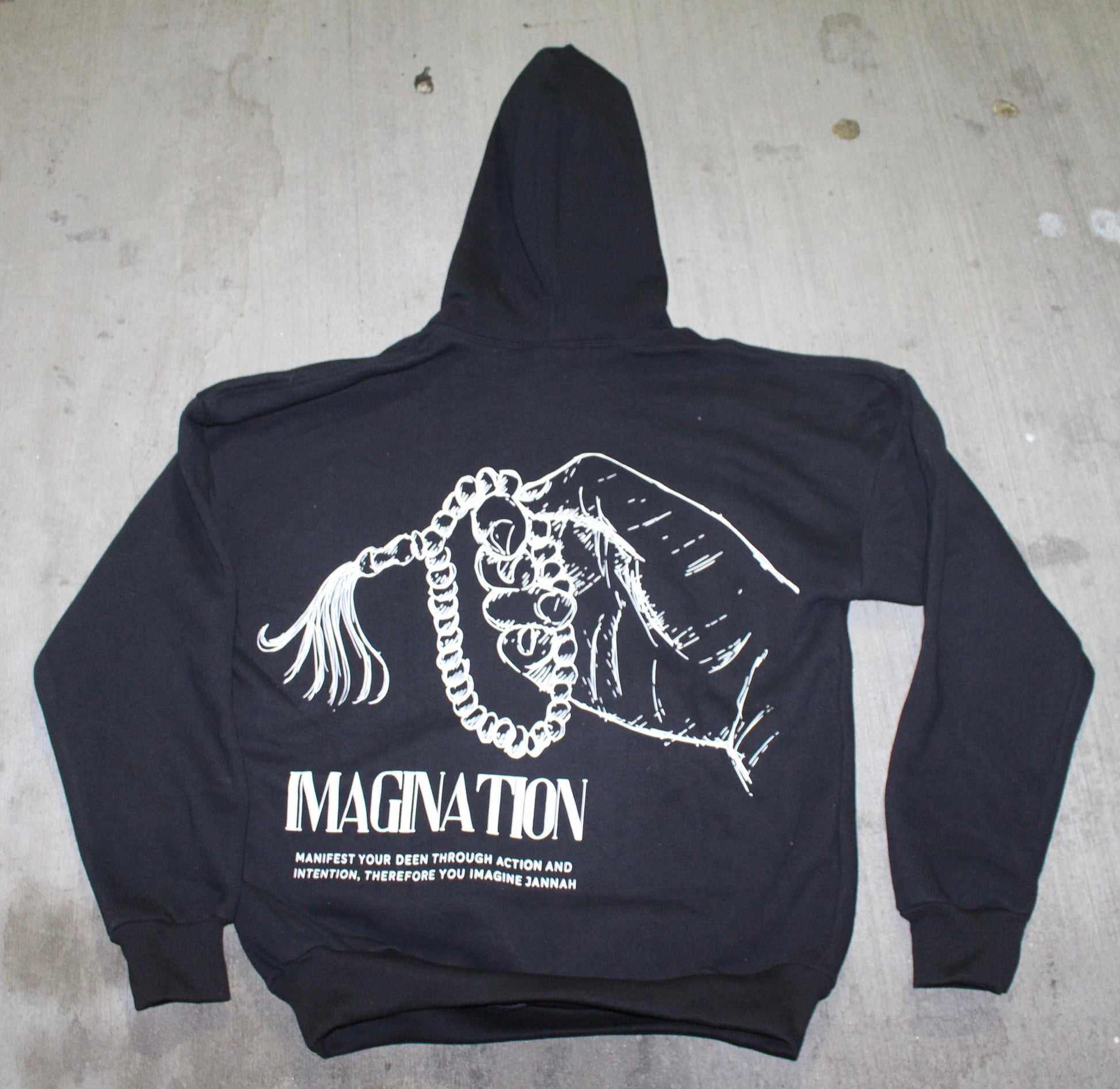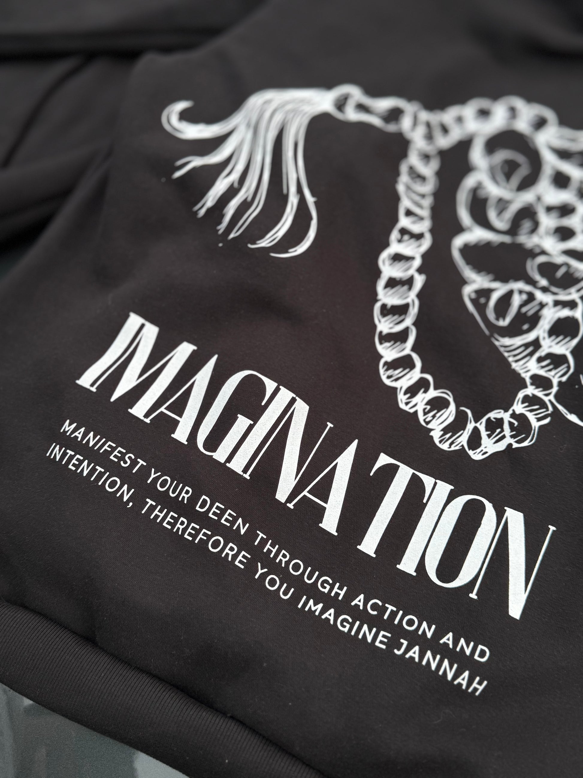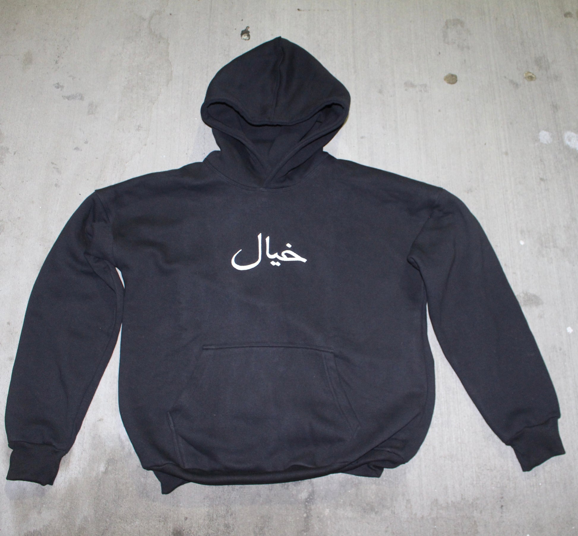 Crafted from 100% heavyweight cotton (450 GSM), the IMAGINATION Hoodie combines comfort, durability, and meaning. The front features the Arabic word خيال (Khayal), translating to Imagination. On the back, a hand-drawn graphic of prayer beads is paired with the message: